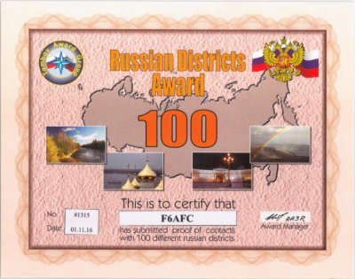 délivré aux OM et SWL pour avoir confirmation de 100 districts russes.